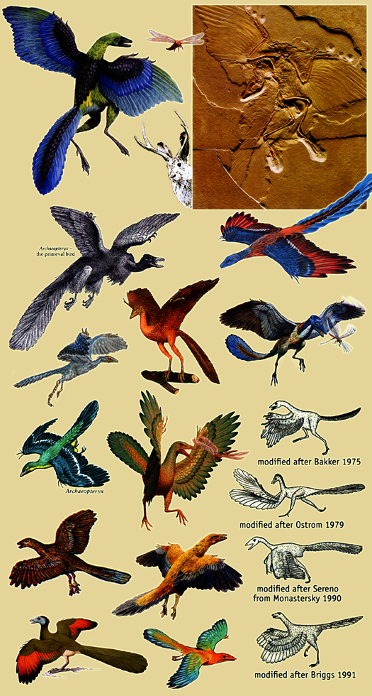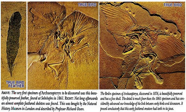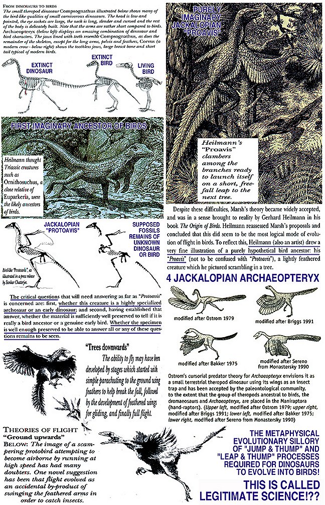 | SINCE THERE ARE NO FOSSIL LINKS BETWEEN "COMPSO, ARCHAEO & CROWS," TRUE BELIEVERS SIMPLY MAKE THEM UP. THEY CALL THESE JACKALOPIAN TRANSITIONAL FORMS PROAVIS AND PROTOAVIS. THESE ARE THE MYTHOLOGICAL BIRDOSAURS OF MACRO-EVOLUTIONARY DINOLOGY. ANOTHER PROOF THAT EVOLUTION IS A RELIGION IS SEEN IN THE FOUR DIFFERENT INTERPRETATIONS OF THE PATRON SAINT ARCHAEOPTERYX. ACCORDING TO THE 4 APOSTLES OF DINOLOGY, OSTROM-BAKKER-BRIGGS-SERENO, THEIR INDIVIDUAL INTERPRETATIONS HAVE CAUSED FURTHER DENOMINATIONAL SPLITS WITHIN THE CHURCH OF SAINT ARCHAEO. THE REAL "LEAP OF FAITH" REGARDING THIS DINO-BIRD SILLORY LIES IN THE TWO OPPOSING "GOSPELS OF FLIGHT." THEY ARE THE "TREES DOWNWARD" OR "JUMP & THUMP" AND THE "GROUND UPWARDS" OR "LEAP & THUMP" GOSPELS AS DEFINED ABOVE. IN SPITE OF THIS SILLORY, THERE HAS NEVER BEEN A WITNESSED RESURRECTION OF ANY DINO-BIRD TRANSITIONAL FORMS. ARCHAEOPERYX AND CORVUS ARE TRUE BIRDS AND COMPSOGNATHUS IS A TRUE THEROPOD DINOSAUR.
