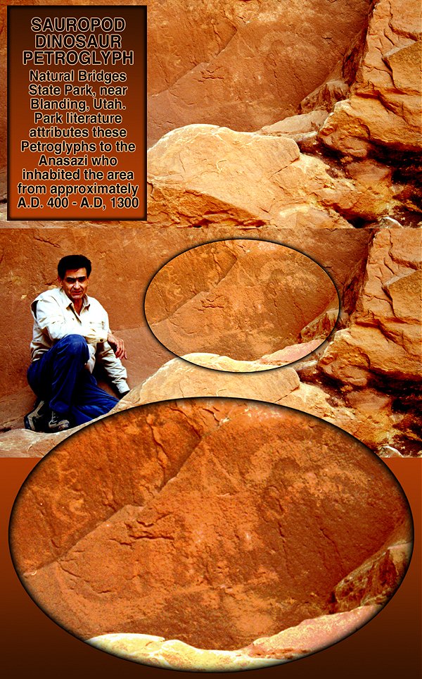 IT STATES THE FOLLOWING. "THERE IS A PETROGLYPH IN NATIONAL BRIDGES NATIONAL MONUMENT THAT BEARS A STARTLING RESEMBLANCE TO A DINOSAUR, SPECIFICALLY A BRONTOSAURUS, WITH A LONG TAIL AND NECK, SMALL HEAD AND ALL."