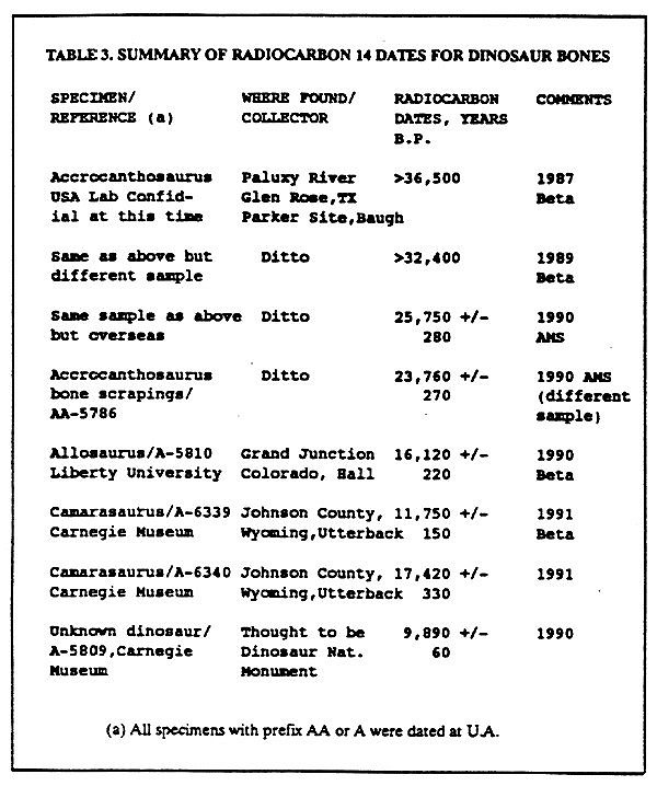 THE FACT THAT ANY C-14 CAN BE DETECTED AT ALL DEMANDS A TOTAL REJECTION OF THE METAPHYSICAL GEOLOGIC COLUMN AND A COMPLETE REPLACEMENT OF THE "GREAT AGE" MACRO-EVOLUTIONARY PARADIGM, AS IT RELATES TO MAN & DINOSAURS!