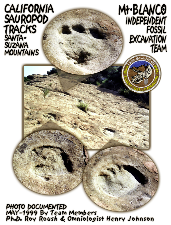 | I...found a lot of tilted horizontally deposited sandstone all tilted at a 40 degree angle with lots of concretions in it,... It is similar to the sandstone at Tuba City i.e. Navajo Sandstone; except it is not crossbeded. But it is a medium course conglomerate more like Dinosaur Monument, and the Cleveland Lloyd Quarry in the middle of Utah; except they have clasts of silicon (quartz, jasper, agate, etc.) and clay bentonite and courser sandstone in the matrix of fine grained quartz sandstone that are larger (about an eighth of an inch in diameter average); than the L.A. beds. This is the type of rock you would expect to find fossil bones or trees in. That is how I discovered mammal bones in Cajon Pass, California, and bones above the tracks at Tuba City, Arizona. AS MORE INFORMATION IS COLLECTED ON THESE TRACKS, THIS PAGE WILL BE UPDATED. Return to Contents |