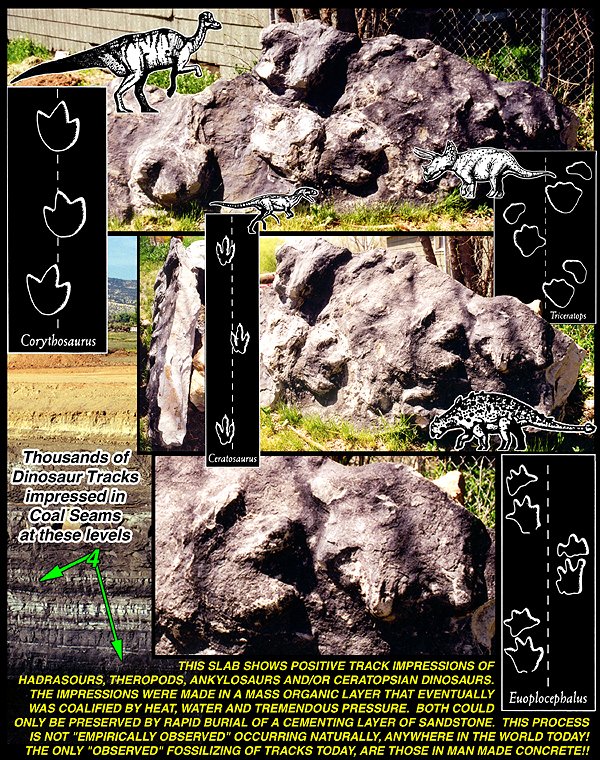 THE READER NEEDS TO KEEP IN MIND THAT, CONTRARY TO THE METAPHYSICALLY "ACCEPTED" | GEOLOGICAL WORLD VIEW, ALL OF THESE DINOSAUR TRACKS HAD TO BE MADE BETWEEN OR DURING THE RAPID "HORIZONTAL" (NOT VERTICAL) DEPOSITION OF THE STRATA THEY ARE FOUND IN! EMPIRICAL SCIENTIFIC RESEARCH (CLICK ON PAGE LINK BELOW) AND COMMON SENSE VERIFY THIS!