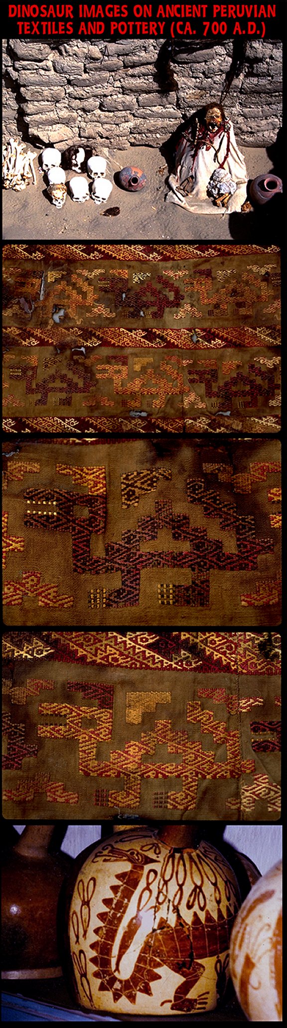 THESE TEXTILES DEPICT LIVING DINOSAURS AS DO THEIR CEREMONIAL BURIAL STONES AND POTTERY, INDICATING THAT THESE AWSOME CREATURES WERE STILL ALIVE AT THE TIME AND THAT ANCIENT PERUVIANS SAW THEM! Return to Contents