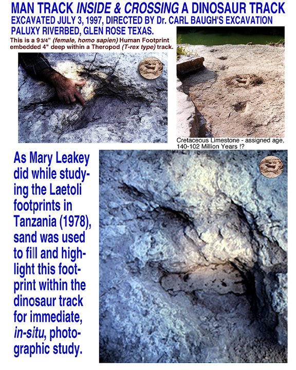 THIS HUMAN FOOT PRINT IS THE FIFTH IN A SERIES OF NINE, LEFT-RIGHT 9-3/4", "FEMALE" HUMAN FOOTPRINTS THAT HAVE BEEN EXCAVATED BETWEEN 1982-1998. THE IDENTIFICATION IN 1982, THAT THEY ARE FEMALE FOOTPRINTS, WAS DONE BY A FORENSIC EXPERT WHO WORKED FOR THE DALLAS POLICE DEPARTMENT. WHEN ASKED BY DR. CARL BAUGH, WHY HE BELIEVED THEY WERE FEMALE, HE SAID HIS RESEARCH HAS SHOWN THAT THE WIDTH OF THE HEAL, IN PROPORTION TO THE WIDTH OF THE FOOT, WAS NARROWER FOR FEMALES THAN IT IS FOR MALES. | THE EMPIRICAL VERIFICATION OF NEARLY 100 MAN TRACKS, CROSSING OVER, STEPPING IN AND BEING STEPPED ON BY DINOSAURS, IN THE PALUXY RIVER BASIN OF GLEN ROSE, TEXAS IS INDISPUTABLE EVIDENCE THAT MAN AND DINOSAURS ONCE LIVED TOGETHER. WITH THE INCA DINOSAUR BURIAL STONES, CERAMIC DINOSAURS, PETROGLYPH DINOSAUR CARVINGS AND HISTORICAL RECORDS OF DINOSAURS ON THIS WEB SITE, ONLY A VERY TIGHTLY CLOSED MIND WOULD IGNORE OR NOT WANT TO INVESTIGATE THIS EVIDENCE FOR THEMSELVES. WHICH ARE YOU? A PUBLIC DIG IS HELD EVERY JUNE FOR THOSE SCEPTICS THAT WANT TO SEE FOR THEMSELVES. VISIT THE C.E.M. WEB SITE BELOW FOR DETAILS. CLICK HERE To Visit The CREATION EVIDENCE MUSEUM Return to Contents |