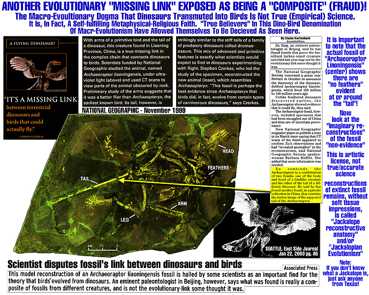 | THE NATIONAL GEOGRAPHIC SOCIETY, "THE" PRIMARY PUBLIC RELATION ARM OF THE SCIENTIFIC COMMUNITY, WAS ASKED NOT TO PUBLISH THIS "MISSING LINK" ARTICLE UNTIL AN OBJECTIVE EVALUATION AND EXAMINATION COULD BE DONE BY A PANEL OF SCIENTIFIC INVESTIGATORS. BY IGNORING THIS ADVICE, THE N.G.S. HAS SUCCESSFULLY DISCREDITED ITSELF AND THE SCIENTIFIC COMMUNITY, AND SHOULD NO LONGER BE TRUSTED BY THE PUBLIC AS AN OBJECTIVE AND UNBIASED SCIENTIFIC PUBLICATION. TO THEIR CREDIT, WE CAN SAY THAT IT IS AN EXCELLENT PHOTOGRAPHIC ART MAGAZINE AS WELL AS A PREEMINENT, MACRO-EVOLUTIONARY TABLOID AND PROPAGANDA TOOL. TO UNDERSTAND WHAT MOTIVATES EVOLUTIONISTS TO PROMOTE THEIR METAPHYSICAL "RELIGIOUS" BELIEFS IN THIS WAY, READ OUR WEB PAGE "HOW EVOLUTION BECAME A RELIGION" WHICH WAS WRITTEN BY AN EVOLUTIONIST. Return to Contents |