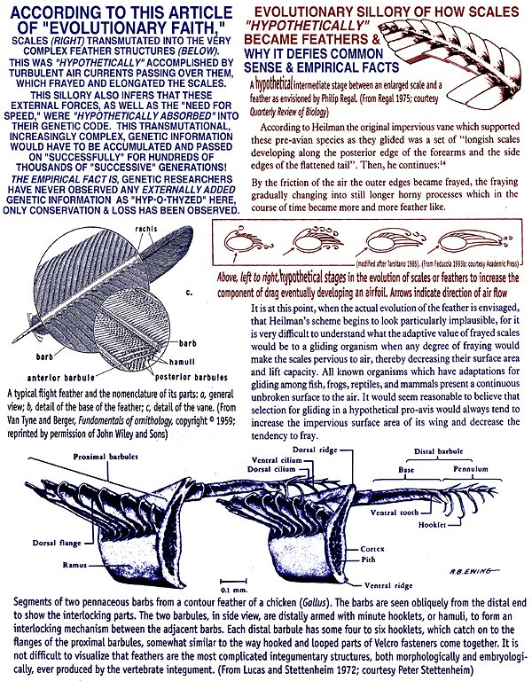 | 1. EMPIRICAL RESEARCH HAS CONSISTENTLY DEMONSTRATED THAT THE PHYSICS OF AN AIRFOIL REQUIRE A NON-PERVIOUS SURFACE TO SUCCESSFULLY AND EFFICIENTLY SUPPORT GLIDING OR FLIGHT. IF SCALES USED FOR GLIDING BECOME FRAYED AT THEIR POSTERIOR EDGES THEIR PREVIOUS EFFICIENCY IS DECREASED. FRAYING WOULD IMMEDIATELY BEGIN TO SHORTEN THE DISTANCE THE GLIDER COULD GLIDE, WHICH IN TURN WOULD REDUCE ITS CHANCES OF SURVIVAL. A SIMPLE TEST OF THIS CAN BE DONE WITH A PAPER KITE OR AIRPLANE. PROGRESSIVELY FRAY (SHRED) THE BOTTOM EDGES OF THE KITE OR AIRPLANE AND COMPARE ITS ABILITY TO FLY, BETWEEN EACH "FRAYING," WITH HOW IT FLEW BEFORE IT WAS "FRAYED." 2. EMPIRICAL RESEARCH HAS CONSISTENTLY DEMONSTRATED THAT THE GENETIC ACCUMULATION OF "EXTERNAL MODIFICATIONS" TO BIOLOGICAL SYSTEMS ARE NOT INHERITED OR PASSED ON TO SUCCESSIVE GENERATIONS, WHICH IS REQUIRED HERE. THIS IS KNOWN AS "THE DOCTRINE OF LAMARKIAN EVOLUTION," WHICH CLAIMED THAT GIRAFFES EVOLVED LONG NECKS & LEGS BY CONSTANTLY STRETCHING FOR FOLIAGE JUST OUT OF REACH. THIS SILLORY HAS LONG BEEN REJECTED BY THE EVOLUTIONARY CLERGY. APART FROM THE "METAPHYSICAL" MACRO-EVOLUTIONARY DOGMA ATTACHED TO BIOLOGY TODAY, THE ONLY EMPIRICAL GENETIC FACTS KNOWN TO SCIENCE REGARDING "EVOLUTIONARY" CHANGE OF ANY BIOLOGICAL SPECIES IS "MICRO-EVOLUTIONARY" IN NATURE, NOT "MACRO-EVOLUTIONARY." MICRO-EVOLUTIONARY CHANGE IS, EMPIRICALLY, "VARIETAL" CHANGE WITHIN LIMITED GENETIC BOUNDARIES OF A SPECIFIC SPECIES. THERE ARE MANY "VARIETIES" OF REPTILES WITH SCALES AND THERE ARE MANY "VARIETIES" OF BIRDS WITH FEATHERS. MACRO-EVOLUTIONARY CHANGE IS, METAPHYSICALLY, "TRANSMUTATIONAL" CHANGE WITH UNLIMITED GENETIC BOUNDARIES OF ALL SPECIES. THERE ARE NO REPTIRDS WITH SCETHERS AND THERE ARE NO BIRTILES WITH FETHALES. 3. EMPIRICAL RESEARCH HAS CONSISTENTLY DEMONSTRATED THAT THE FOSSIL RECORD HAS ONLY PRODUCED FOSSILS OF BIRDS WITH FEATHERS AND REPTILES WITH SCALES. AS OF THIS DATE, 11-3-2000, THERE HAS NEVER BEEN A SINGLE, INDISPUTABLE DISCOVERY OF A "SCETHER OR FETHALE" LET ALONE A "REPTIRD OR BIRTILE!" IF ANYONE READING THIS CAN PRODUCE INDISPUTABLE EMPIRICAL EVIDENCE TO THE CONTRARY, PLEASE CONTACT US AND WE WILL POST IT ON THIS WEB SITE. Return to Contents |