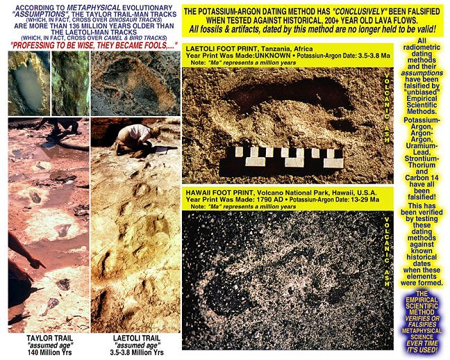 SINCE SCIENTISTS CANNOT DISTINGUISH BETWEEN PRIMORDIAL & INSITU ARGON FROM RADIOMETRIC DECAY OF POTASSIUM AT THIS TIME. AND THE FACT THAT KNOWN HISTORICAL EVENTS HAVE FALSIFIED THIS K-Ar DATING METHOD...ALL DATES ASSIGNED TO FOSSILS AND ARTIFACTS BY THIS DATING METHOD CAN NO LONGER BE ACCEPTED AS ACCURATE OR RELIABLE!