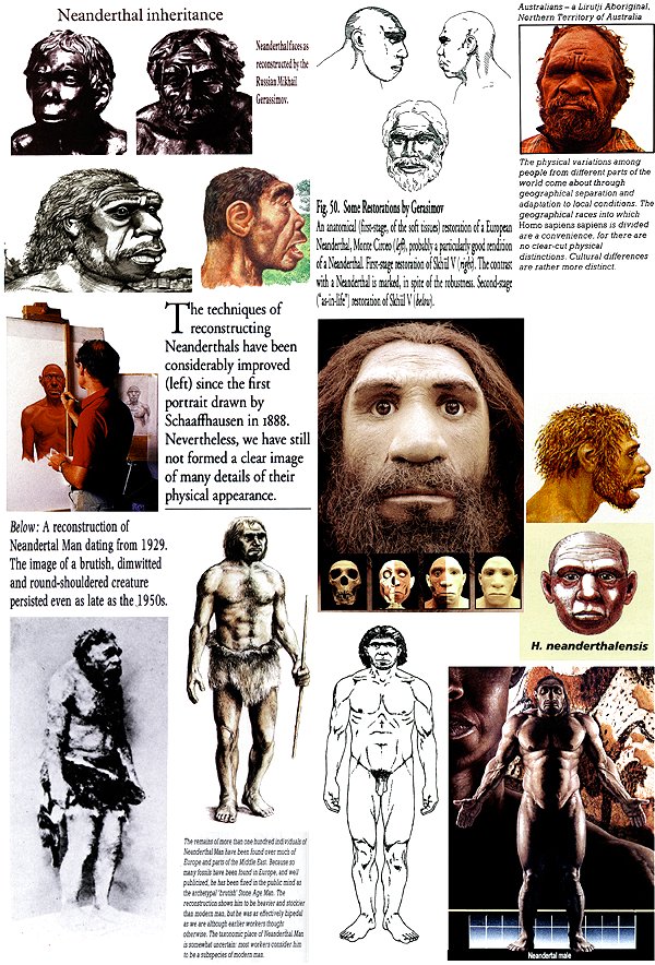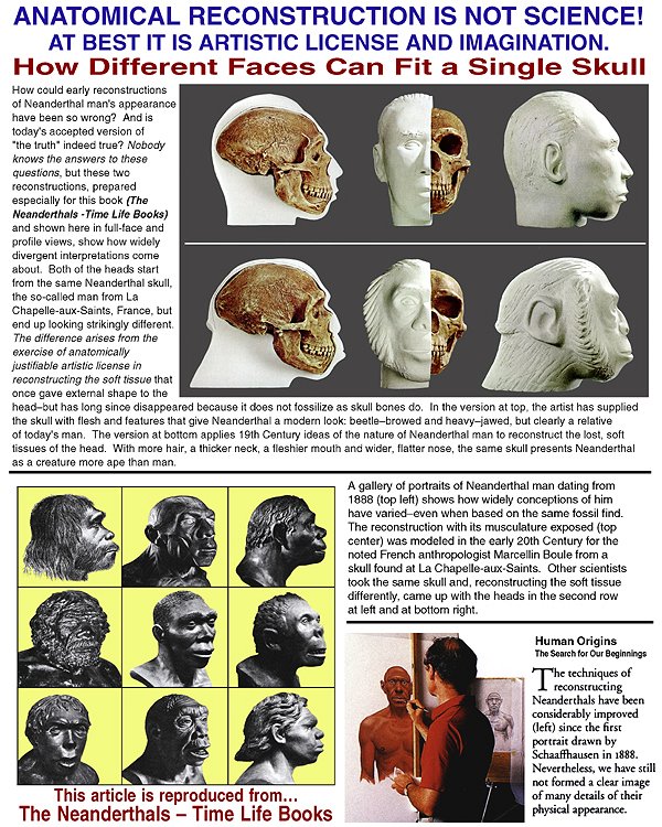 | "THE NEANDERTHALS." LOWER RIGHT IS FROM THE BOOK "HUMAN ORIGINS The search for our beginnings" THIS HONEST AND UNBIASED EVALUATION OF RECONSTRUCTIVE ANATOMY IS NOT ONLY TRUE REGARDING THE NEANDERTHALS. WHAT'S IMPORTANT TO UNDERSTAND ABOUT THE FIRST FEW SENTENCES IN THIS ARTICLE IS THAT THEY APPLY TO "ANY RECONSTRUCTION" OF SUPPOSED ANCESTORS OF MAN OR ANIMAL IN THE METAPHYSICAL SCIENCE OF EVOLUTION. THE ONLY PART OF THIS ARTICLE WHERE WE DISAGREE IS THE EXPLANATION FOR WHY THESE RECONSTRUCTIONS ARE SO DIFFERENT. THESE ARE NOT THE PRODUCT OF "ANATOMICALLY JUSTIFIABLE ARTISTIC LICENSE" AT ALL. THEY ARE BOTH, IN FACT, THE PRODUCT OF "ANATOMICALLY SUBJECTIVE ARTISTIC LICENSE" PURE AND SIMPLE! THE ARTISTS WERE GIVEN DIFFERENT INTERPRETATIONS AS TO HOW THEIR END PRODUCT SHOULD LOOK! ONE ARTIST WAS TOLD THAT THIS INDIVIDUAL HAD A "MODERN LOOK" AND WAS "CLEARLY A RELATIVE OF TODAY'S MAN." THE OTHER ARTIST WAS TOLD THAT THIS INDIVIDUAL WAS "A CREATURE MORE APE THAN MAN." ANOTHER INTERESTING OBSERVATION IS THE STATEMENT BELOW HIS PICTURE. "THE GEOGRAPHICAL RACES INTO WHICH HOMO SAPIENS SAPIENS IS DIVIDED ARE A CONVENIENCE, FOR THERE ARE NO CLEAR-CUT DISTINCTIONS. ..." IT APPEARS THAT JACKALOPIAN RECONSTRUCTED ANCESTORS ARE A "CONVENIENCE" AS WELL.