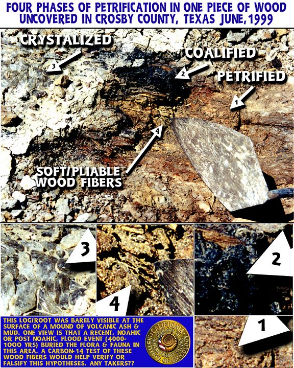 | THIS WOOD APPEARS TO HAVE BEEN BURIED IN RECENT HISTORY, A FEW HUNDRED TO A FEW THOUSAND YEARS AT THE MOST. SINCE THERE IS SOFT WOOD AVAILABLE, A CARBON-14 DATE COULD VERIFY THE APPROXIMATE AGE OF THIS SPECIMEN AS WELL AS THE TYPE OF WOOD IT IS. MANY FOSSILS THAT ARE FOUND HAVE MATERIAL IN THE BONES AND PLANTS THAT ARE DATEABLE BY THE C-14 METHOD. IF ANY DATE CAN BE MADE AT ALL, THIS METHOD WOULD PROVE THAT THE SPECIMEN CAN BE NO OLDER THAN 50,000 YEARS OR LESS! IN THIS TABLE, 1-6 SHOW C-14 DATES FOR CARBONIZED WOOD FROM THE CRETACEOUS LIMESTONE LAYERS OF THE PALUXY RIVER AREA OF GLEN ROSE, TEXAS.
